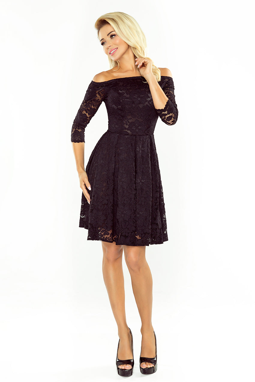 Dress with open arms and 3/4 sleeve. Black lace. Made of thicker material. Polish production. Numoco