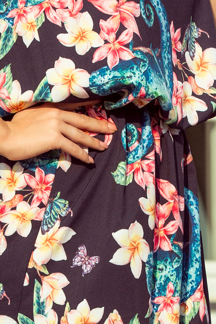 Numoco 191-3 Long dress tied at the neck - chameleons and flowers