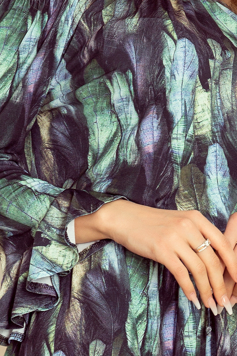 Julie dress with ruffles on the sleeves and flared skirt. Made of flexible material in green feathers. Oversize. The numoco brand.