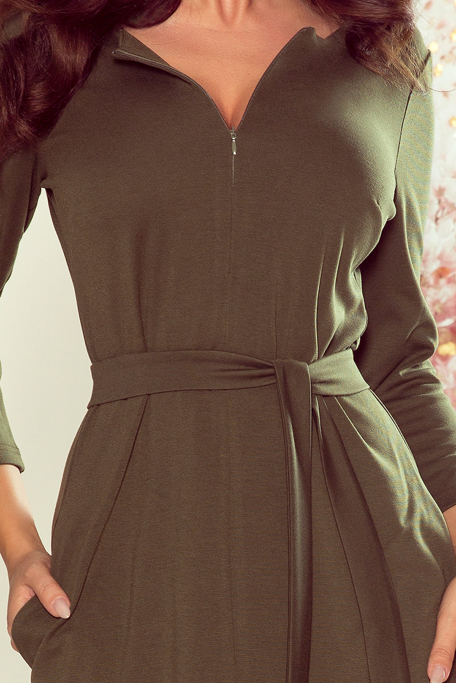 Karen - dress with a zipper, belt and pockets - khaki color. Made of thicker, slightly elastic material (95% viscose, 5% elastane). The numoco brand.
