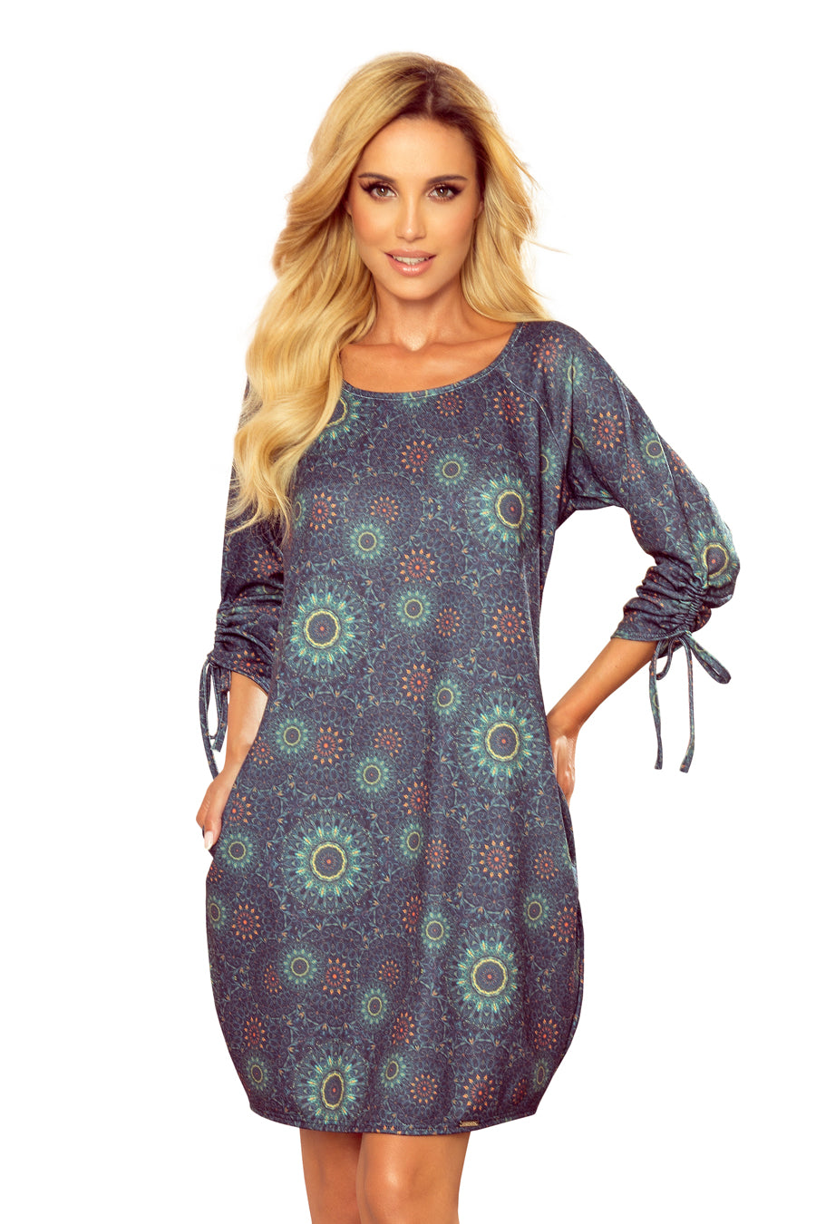 Sophie - comfortable dress with pockets and binding on the sleeves. Polish product. Made of pleasant to the touch warm material with green mandalas. Brand numoco.