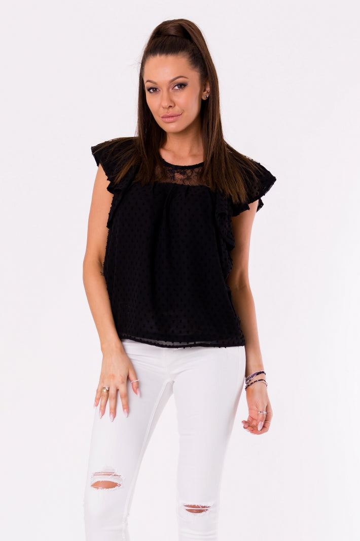 Blouse with a frill on the shoulders, mesh at the neck, small dots