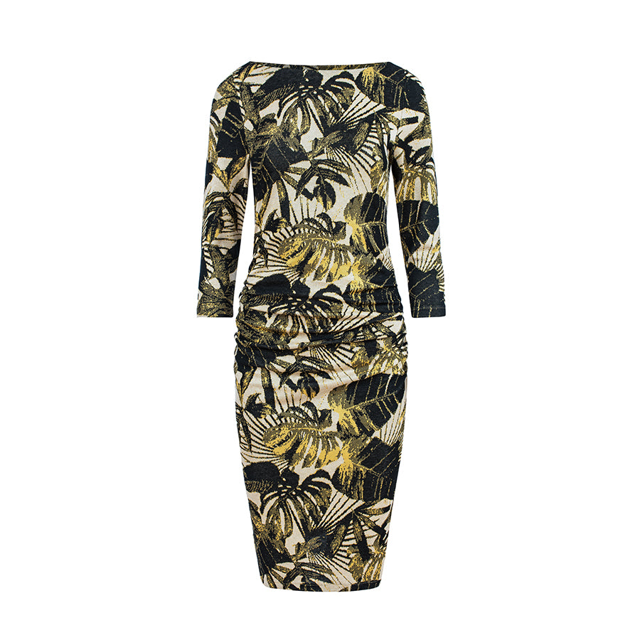 Sweater with ruffles and 3/4 sleeves. Dark large leaves with honey color. Made in Poland. The numoco brand.