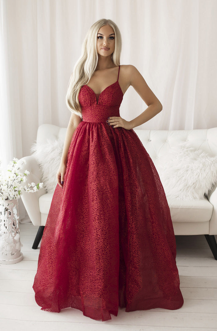 The dress is made of two parts: the top is an adjustable, tied corset and a flared skirt