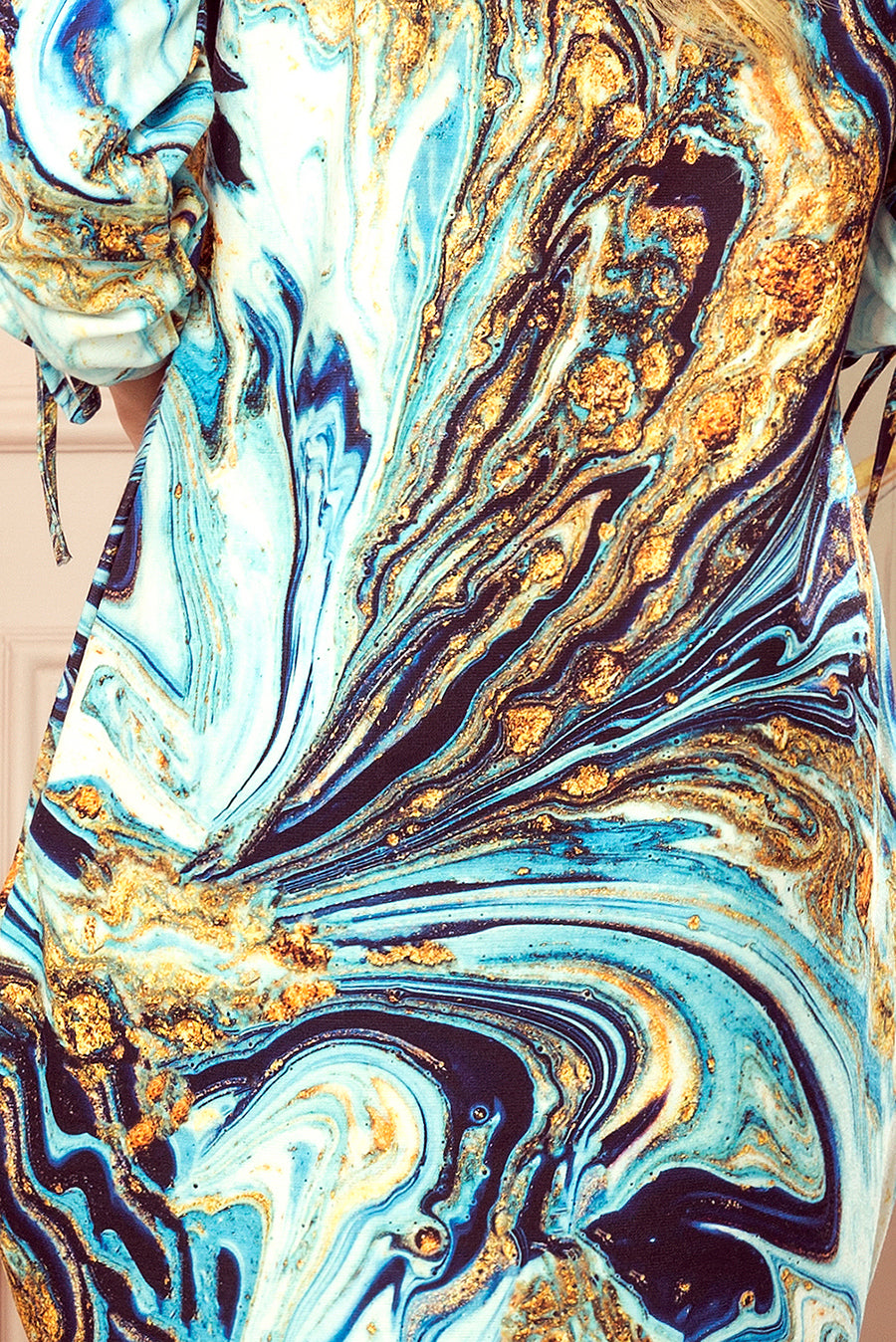 Sophie - comfortable dress with pockets and binding on the sleeves. Polish product. Made of pleasant to the touch warm material with blue-gold waves. Brand numoco.