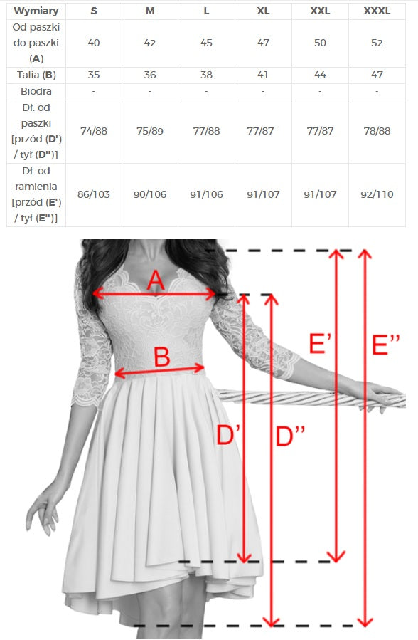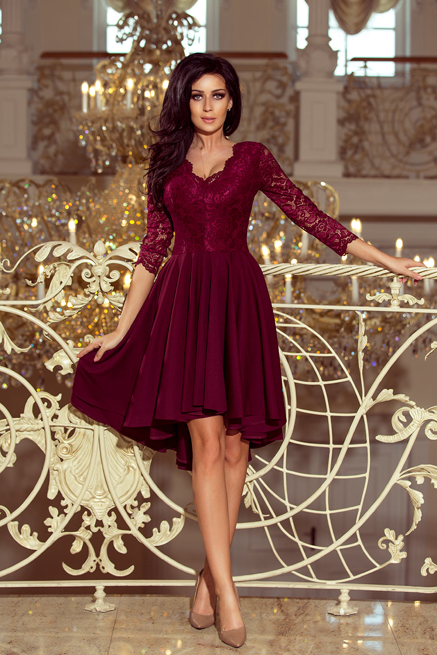Nicolle - asymmetrical exclusive dress with longer back, 3/4 sleeves, neckline and lace. Burgundy color. The lace pattern may vary slightly. A skirt with longer back will be perfect for dancing. Polish production. Numoco